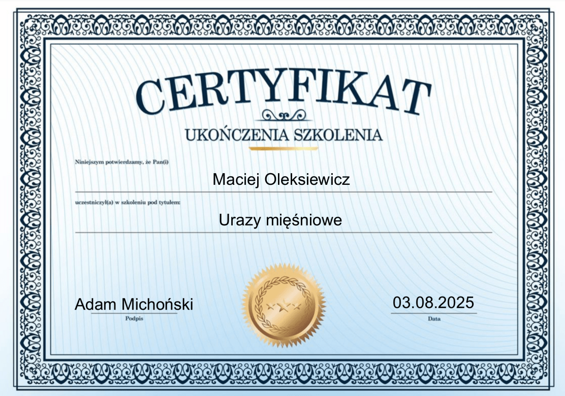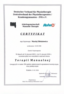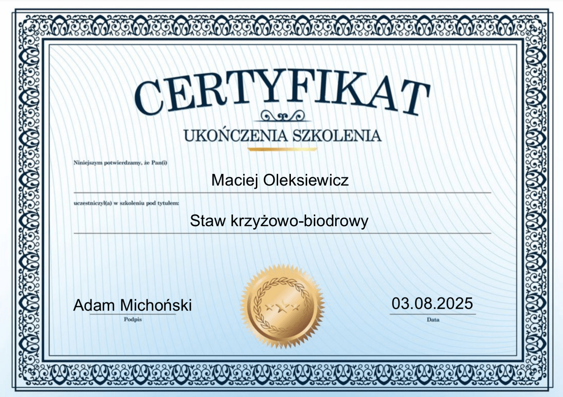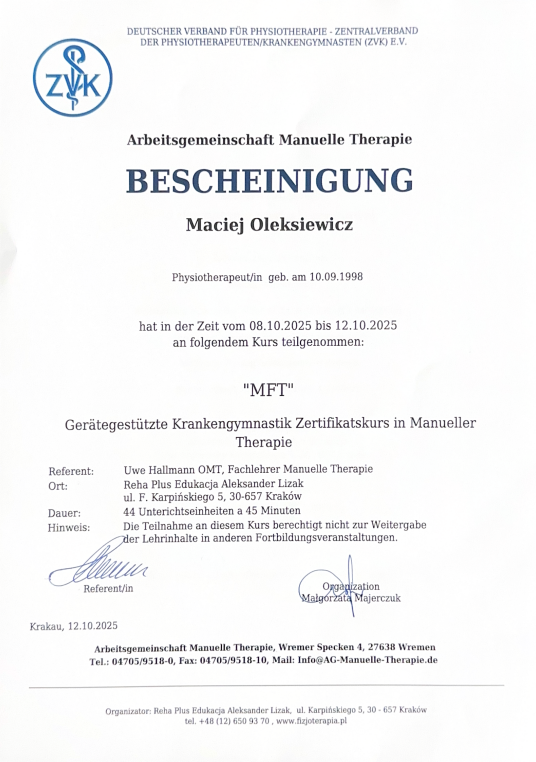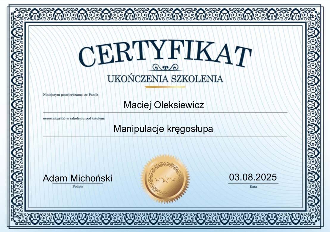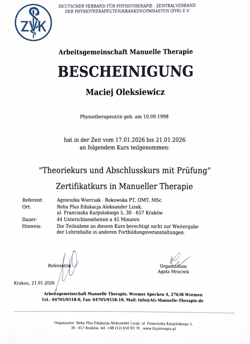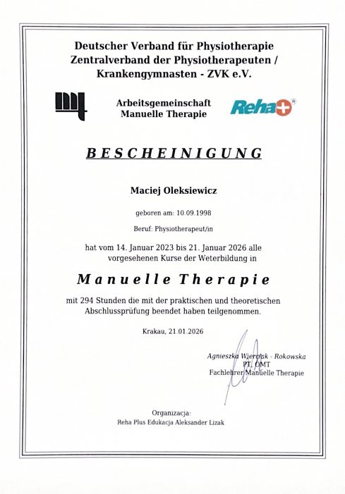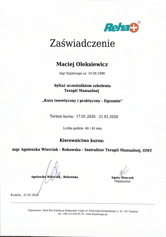 MSc PT Maciej Oleksiewicz, Prawo do wykonywania zawodu medycznego Fizjoterapeuty Nr 75699. Absolwent studiów jednolitych magisterskich fizjoterapii na Akademii Nauk Stosowanych w Tarnowie. Od momentu podjęcia nauki na uczelni wyższej, jego zainteresowania zawodowe skupiły się głównie wokół Medycyny Manualnej (Fizjoterapii, Masażu, Terapii Manualnej, Osteopatii, Chiropraktyki), aby móc w przyszłości prowadzić praktykę kliniczną skierowaną do pacjentów Bólowych, Ortopedyczno-Sportowych, Ortopedyczno-Neurologicznych. Prywatnie od najmłodszych lat jest pasjonatem Tenisa Ziemnego (NTRP 5.0-5.5), Kalisteniki i Wędkarstwa muchowego. Nieustannie się szkoli i swoją przyszłość łączy z pracą manualną w gabinecie.