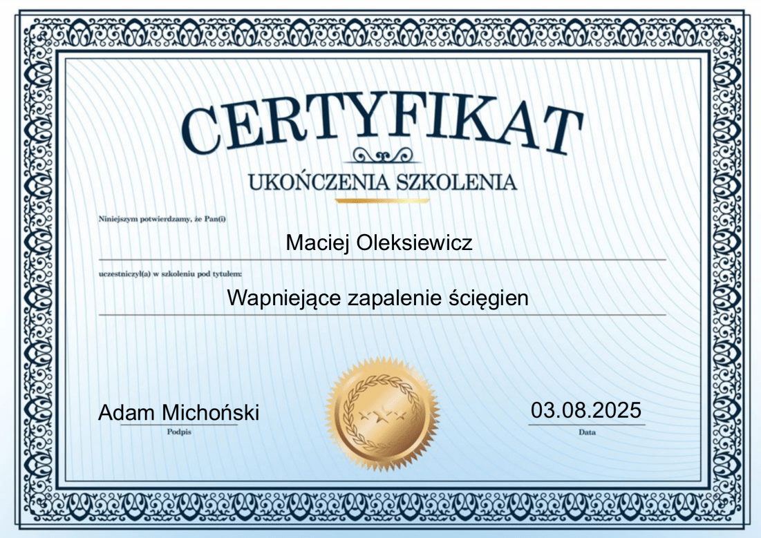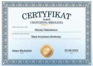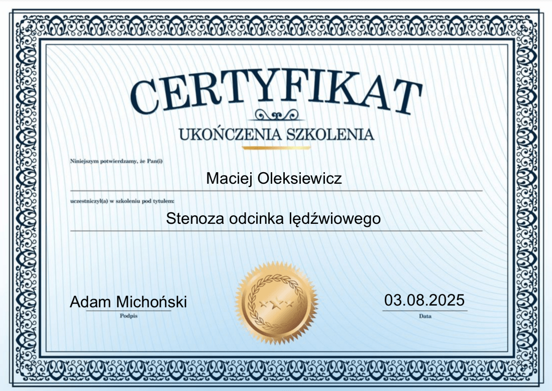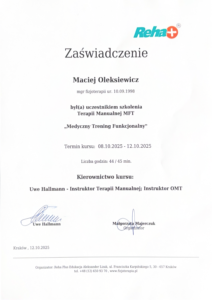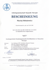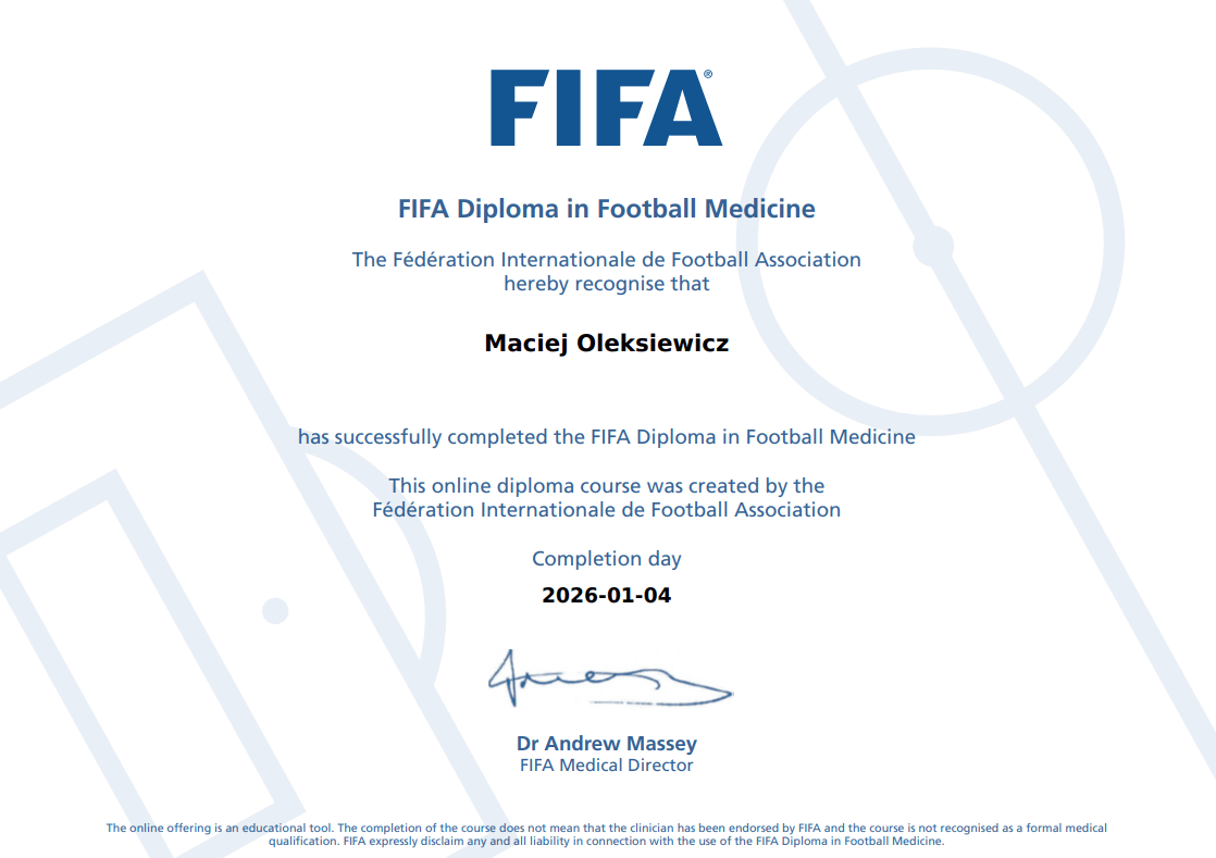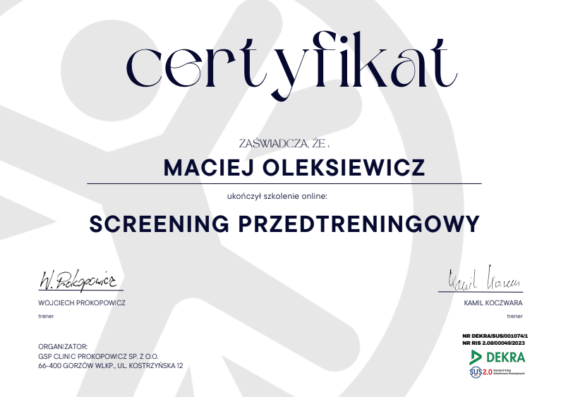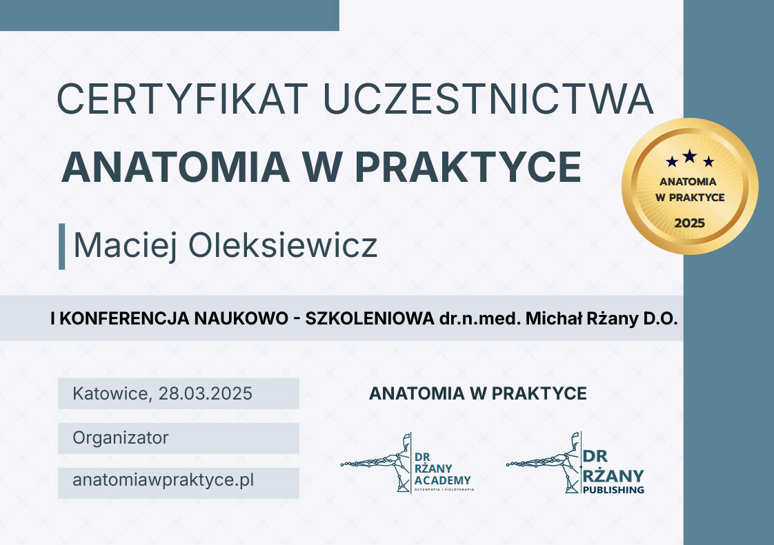 MSc PT Maciej Oleksiewicz, Prawo do wykonywania zawodu medycznego Fizjoterapeuty Nr 75699. Absolwent studiów jednolitych magisterskich fizjoterapii na Akademii Nauk Stosowanych w Tarnowie. Od momentu podjęcia nauki na uczelni wyższej, jego zainteresowania zawodowe skupiły się głównie wokół Medycyny Manualnej (Fizjoterapii, Masażu, Terapii Manualnej, Osteopatii, Chiropraktyki), aby móc w przyszłości prowadzić praktykę kliniczną skierowaną do pacjentów Bólowych, Ortopedyczno-Sportowych, Ortopedyczno-Neurologicznych. Prywatnie od najmłodszych lat jest pasjonatem Tenisa Ziemnego (NTRP 5.0-5.5), Kalisteniki i Wędkarstwa muchowego. Nieustannie się szkoli i swoją przyszłość łączy z pracą manualną w gabinecie.
